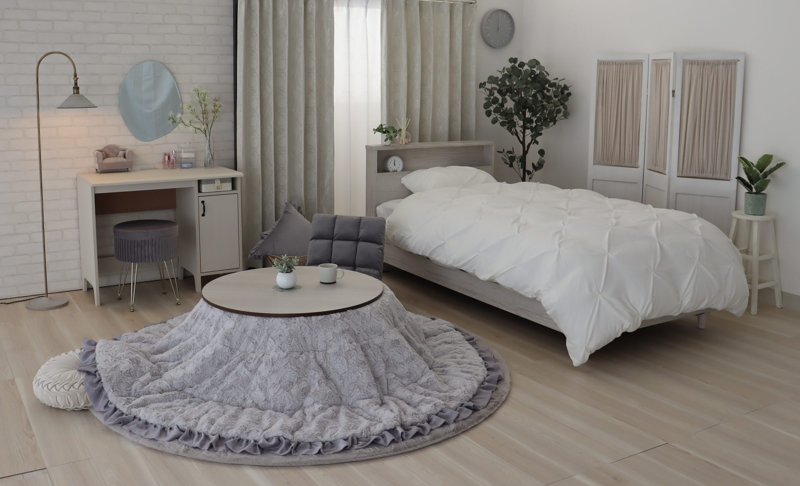ラウンド型のコタツテーブルに、フリル付きのコタツ布団を合わせたスタイルは、まるでお姫さまのような優雅な空間を演出します。