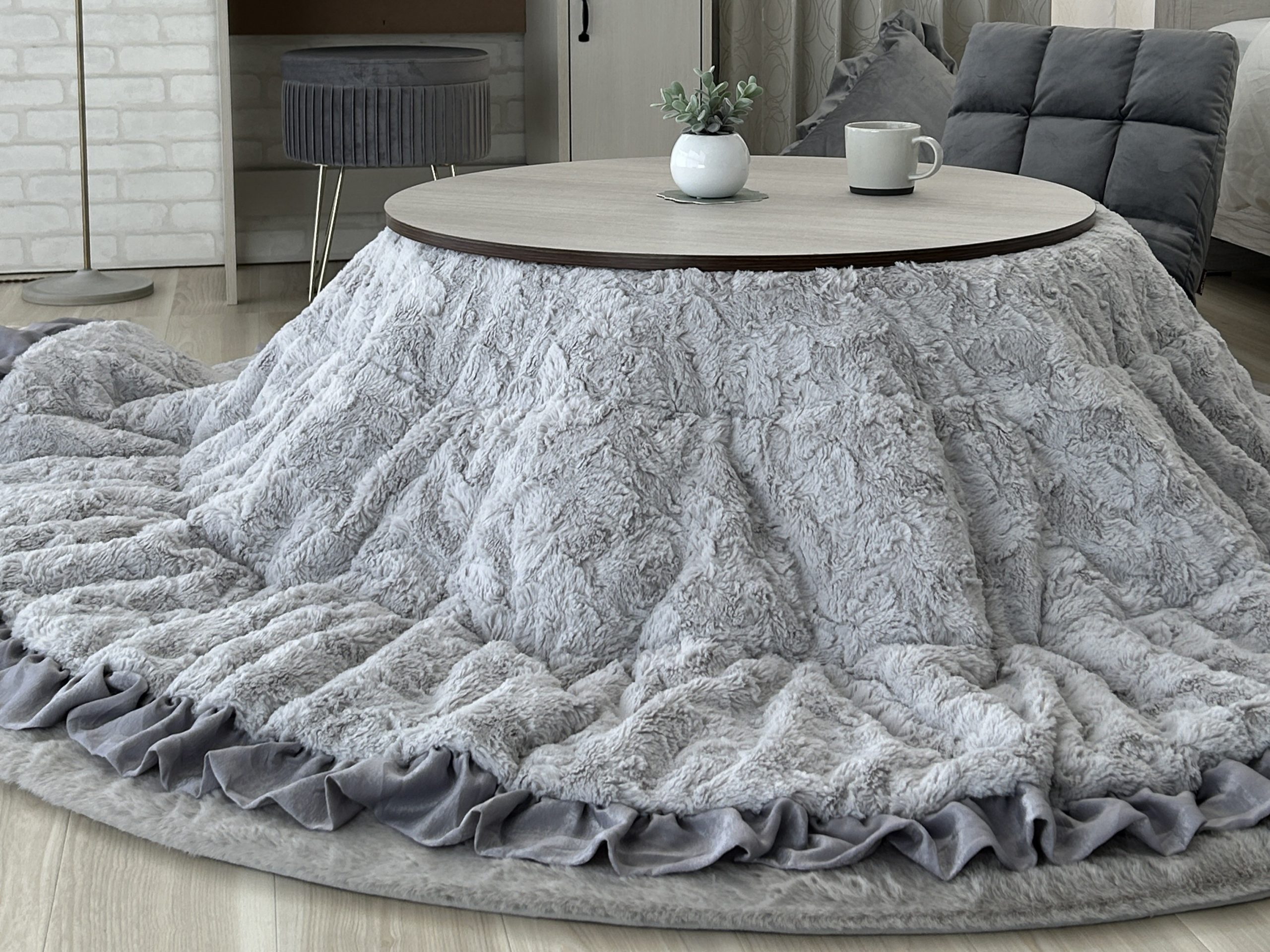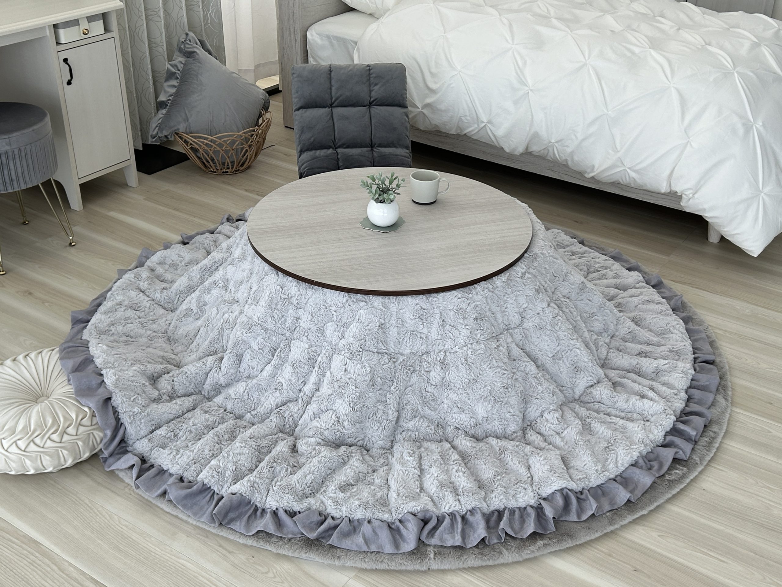 ラウンド型のこたつテーブルに、フリル付きのこたつ布団を合わせたスタイルは、まるでお姫さまのような優雅な空間を演出します。