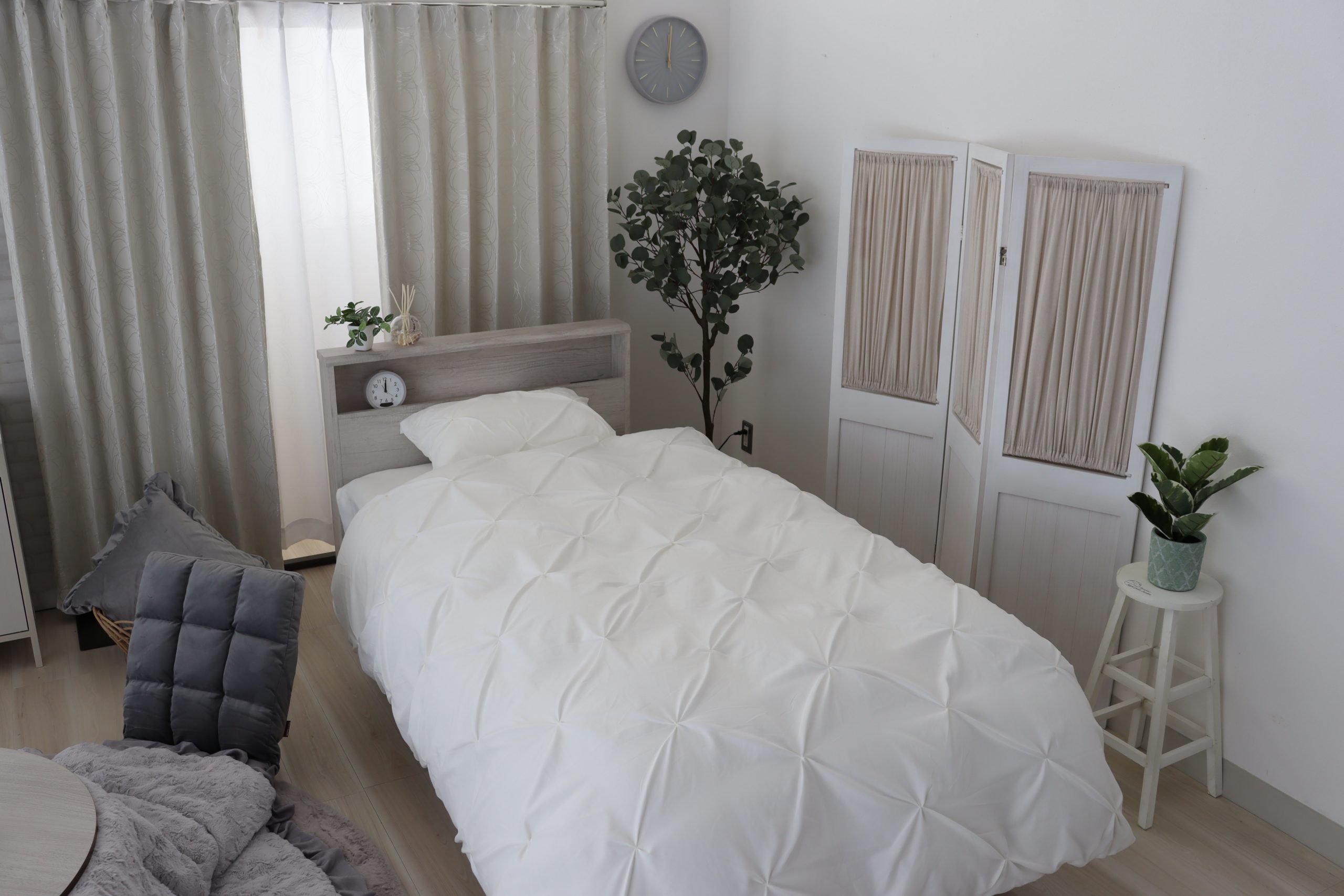 ホワイトを基調としたベッドに、繊細なピンチ加工が施されたふんわり掛け布団カバーをセット。