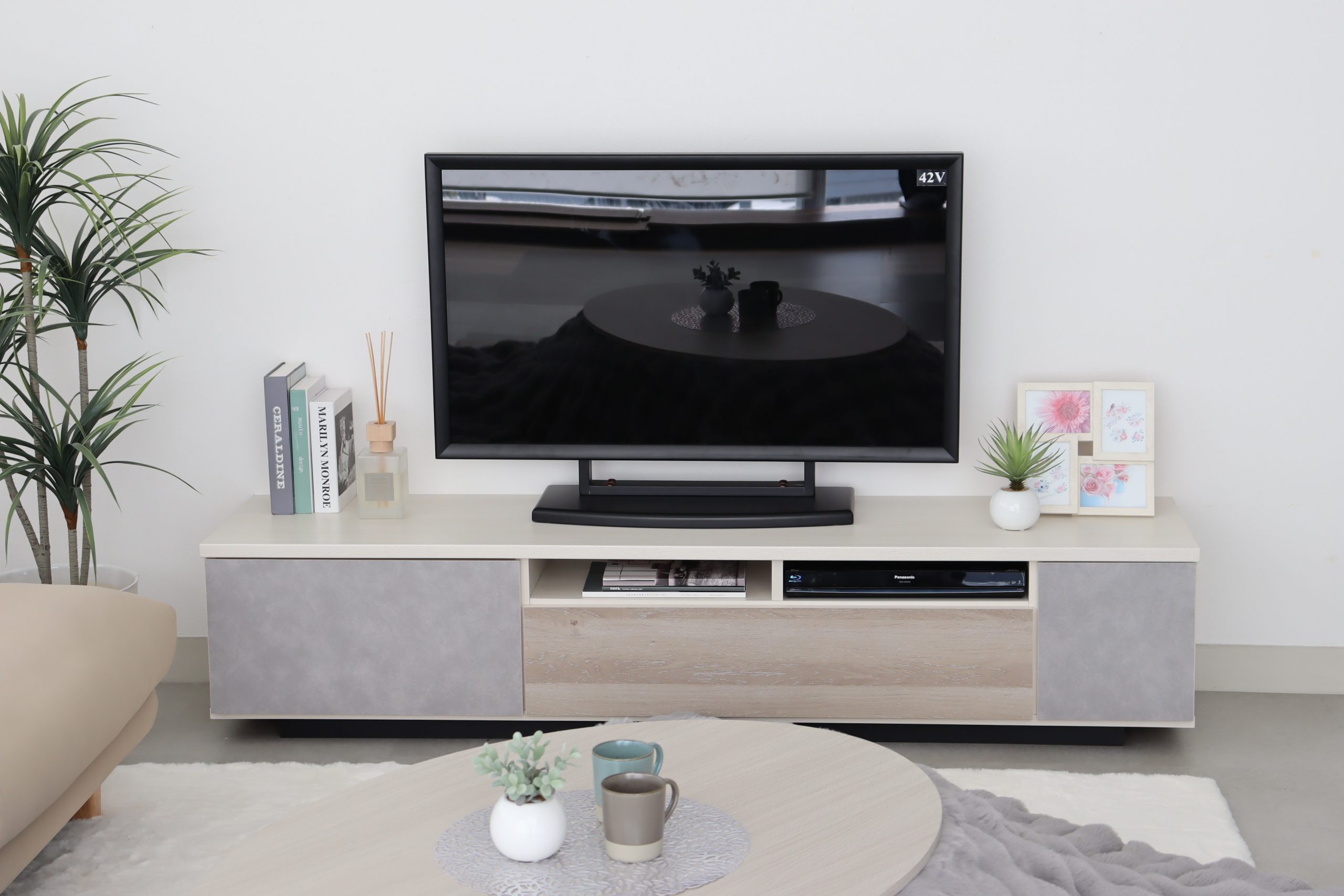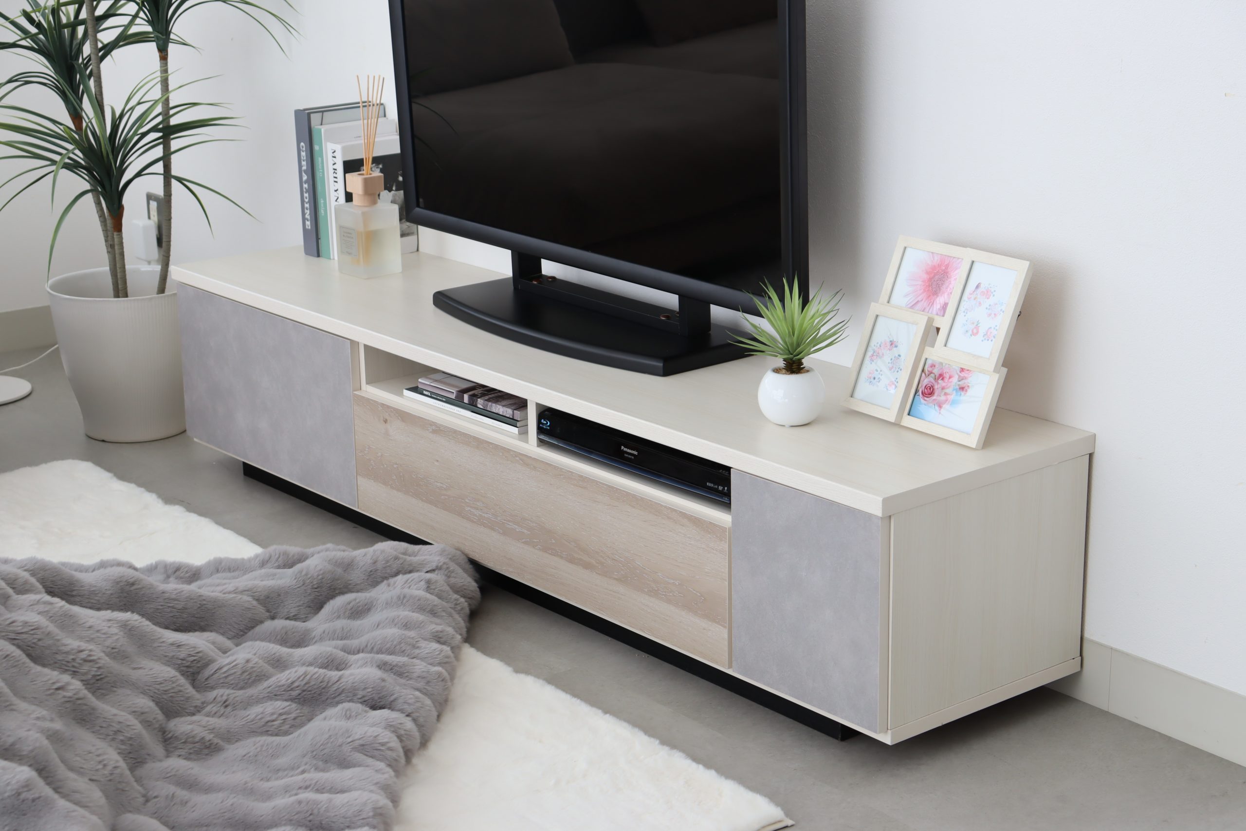 やさしい木目デザインと重厚感のあるコンクリート調を組み合わせたテレビボードは、上質で洗練されたナチュラルモダンな空間を演出。