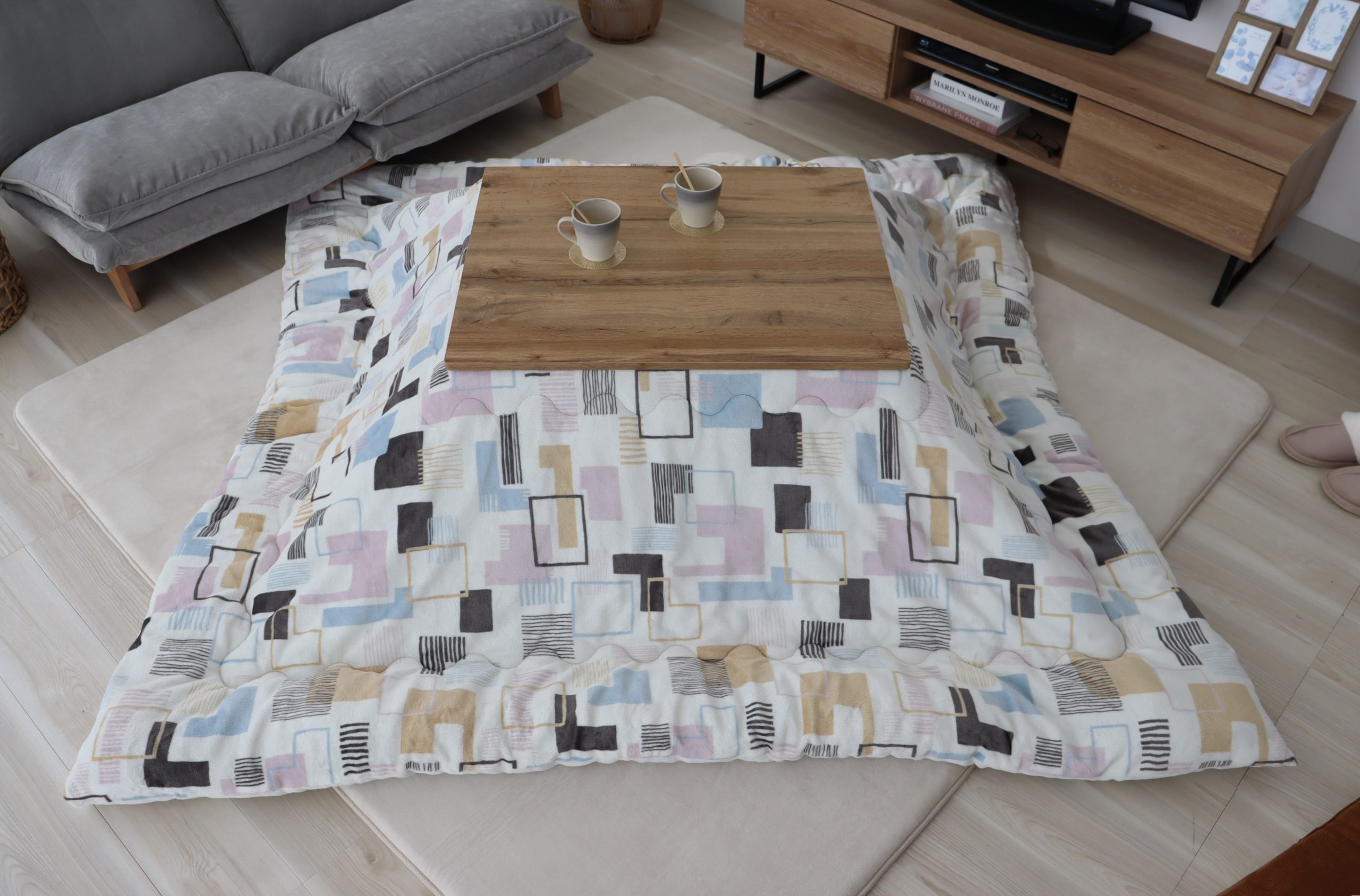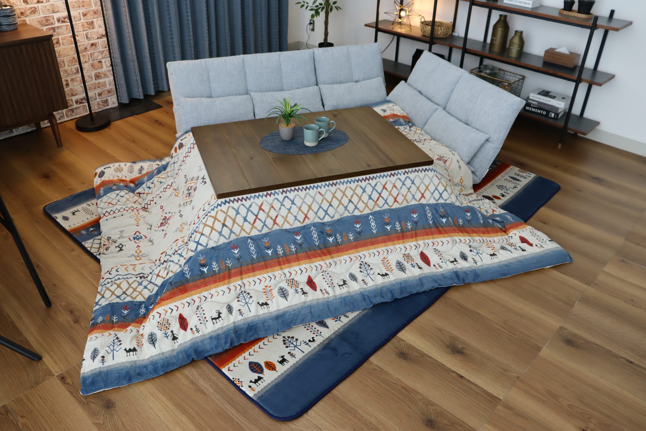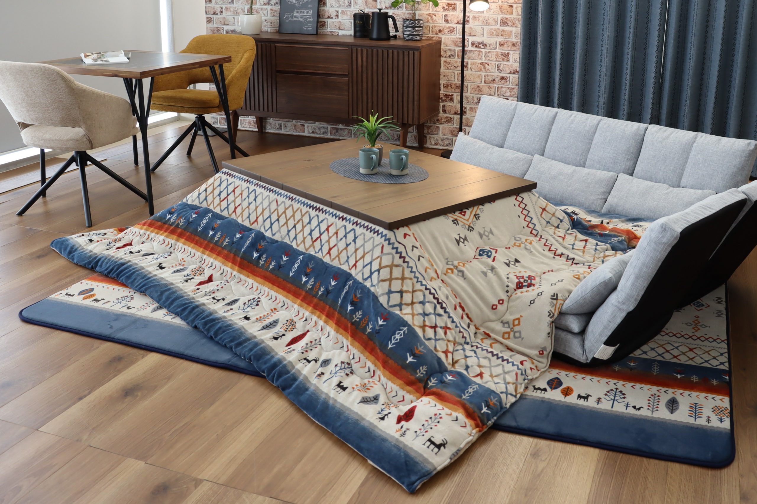 こたつは、木目調の天板とフランネル素材の掛け布団を組み合わせたあったか仕様。