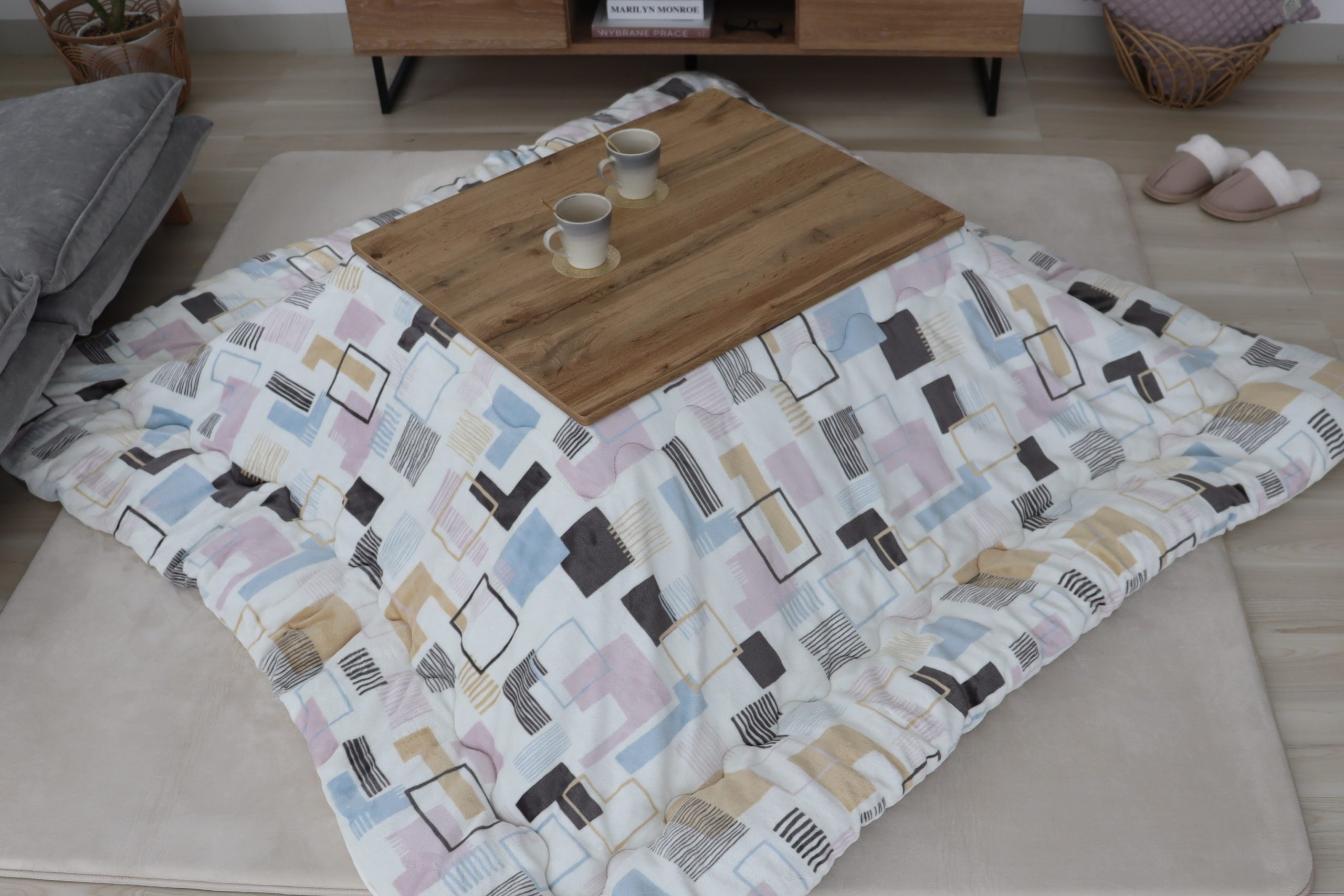 ライトブルー、ピンク、ベージュ、チャコールなどを組み合わせた幾何学柄の掛け布団が、北欧らしい軽やかさと彩りを添えるふんわりとしたフランネル素材のこたつ布団です。
