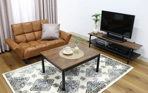 ヴィンテージ感漂うTVボードとキャメルの合皮ソファが絶妙なバランス。