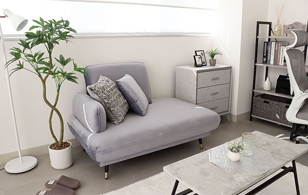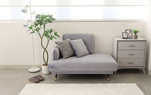 柔らかなグレーカラーの家具とリネンが絶妙なバランス。