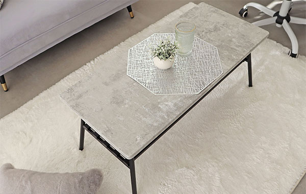 薄くかすれたようなデザインのラグで個性的なコーディネートに。