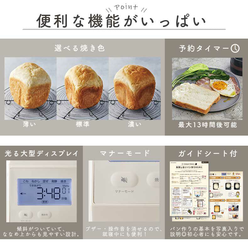 選べる焼き色、予約タイマー(最大13時間後)、光大型ディスプレイ、