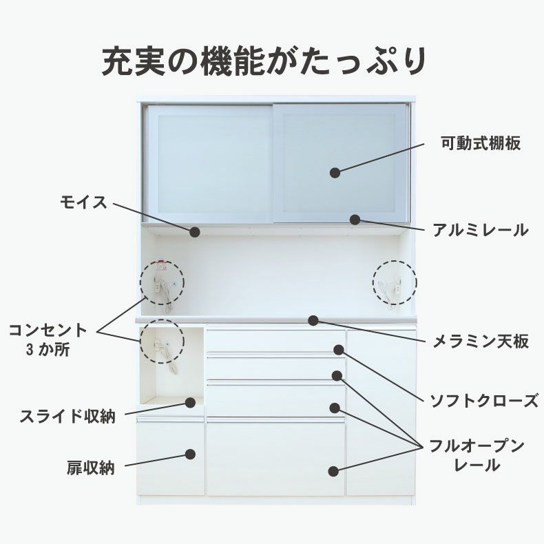 #食器棚#食器入れ#レンジ台#レンジボード#カップボード#水屋#水屋箪笥#キッチンボード#キッチンキャビネット#WH#ホワイト#白#国産#オリジナル#コンセント有り#フルスライド#モイス#上下分割搬入可