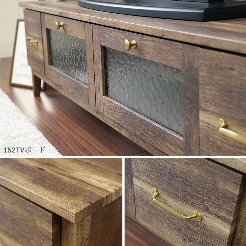 古木風の木目とアンティークゴールドのアクセントがどこか懐かしさを感じさせるリビング家具シリーズ。