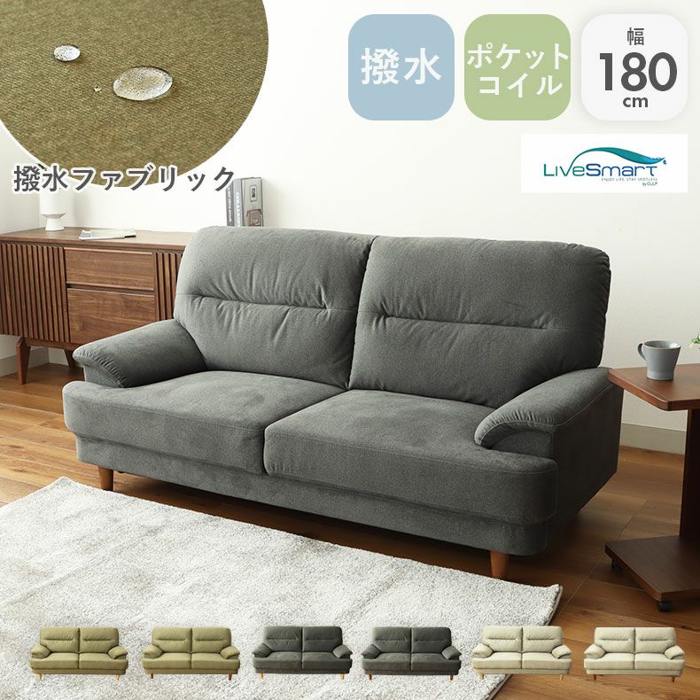 撥水機能でお手入れラクラク、シンプルソファ。ファブリック3色と脚部2色が選べます。