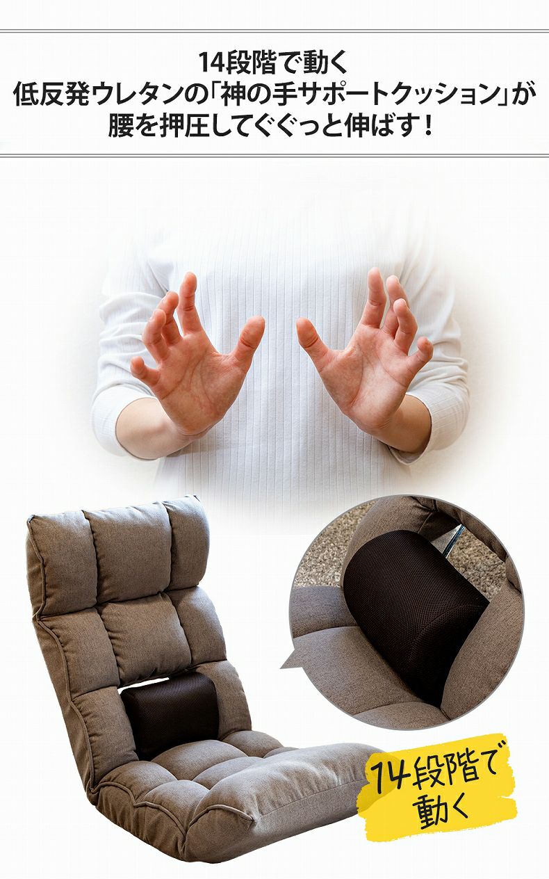 14段階で動く低反発クッションが腰を押圧する座椅子「リフレ」。全部で38,416通りもの細かいリクライニング機能。