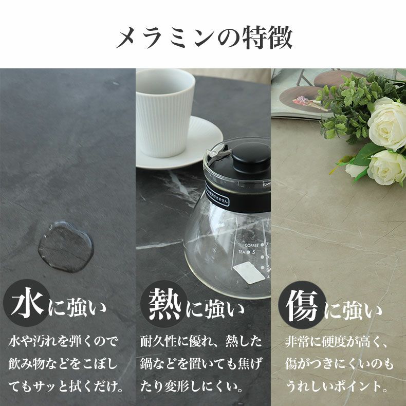 耐久性、耐熱性に優れ、キズや焼け跡、汚れがつきにくいメラミン天板。