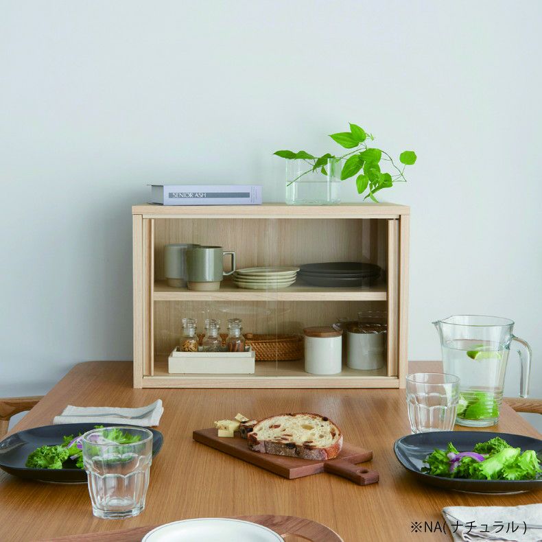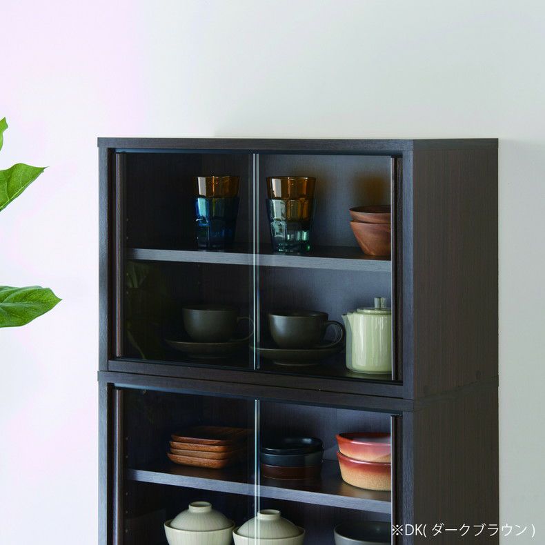 単品でも重ねても使えるガラス引き戸のミニ食器棚。