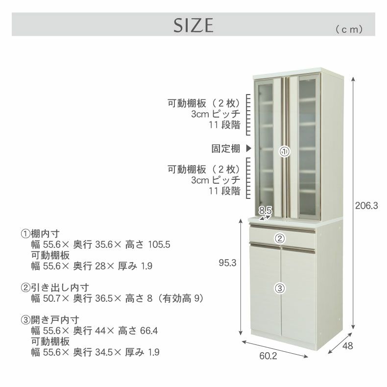 【幅60cm上台食器棚】可動棚は合計4枚。