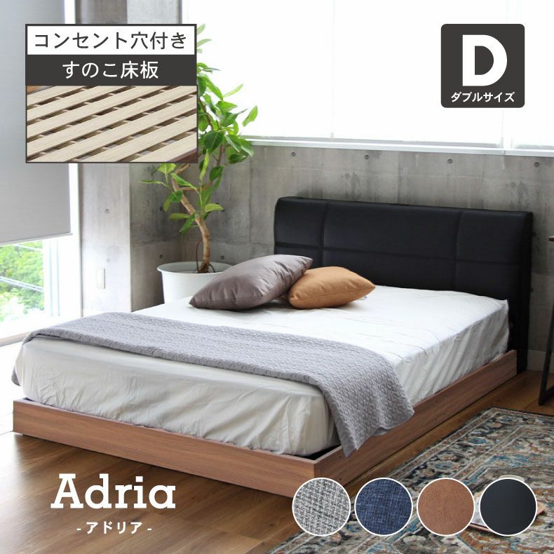様々なカスタマイズを楽しめるロータイプのベッドフレーム「アドリア」。選択中の商品はヘッドタイプ「ハイタイプ(コンセント有)」、床板タイプ「すのこ床板タイプ」です。