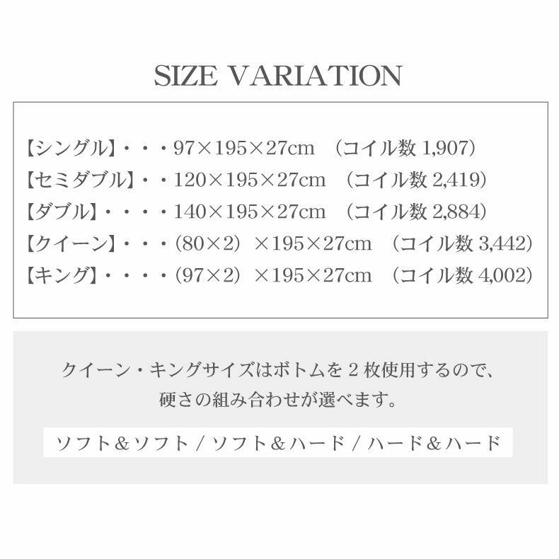 | サイズ | シングル:幅97×奥行195×高さ27(cm) セミダブル:幅120×奥行195×高さ27(cm) ダブル:幅140×奥行195×高さ27(cm) クイーン:幅160×奥行195×高さ27(cm) キング:幅194×奥行195×高さ27(cm) |