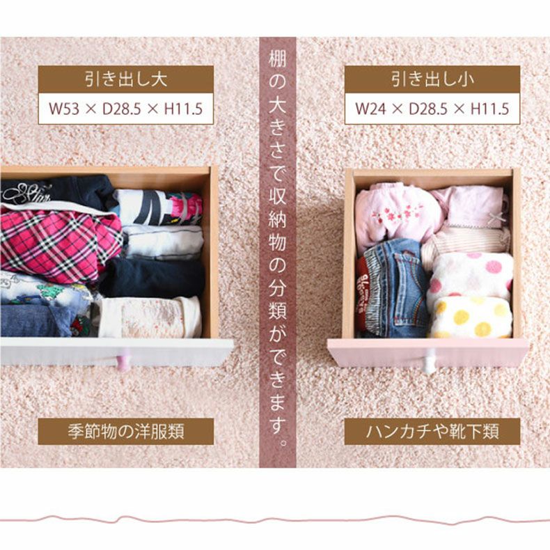 かわいいピンクとさわやかなナチュラル、シックなダークブラウンをご用意。お子様から大人まで幅広い世代にピッタリのシンプルなデザイン。引き出しには衣類から小物までたっぷり収納。