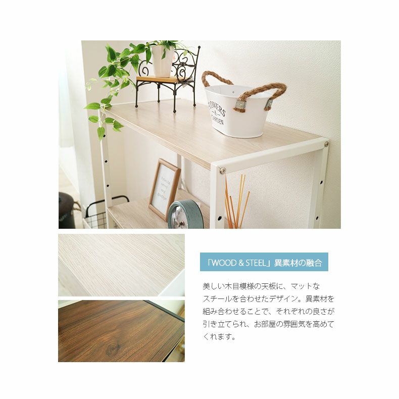 木目の棚とフレームがツートンカラーのシンプルシェルフ。横に棚が追加できるのでお部屋のサイズに合わせてサイズをお選びいただけます。