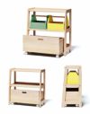 キャスター付きワゴンと、木製ボックス2個がついたトイラック「ノスタ」。身体の触れる部分は面取り加工で丸く滑らか。