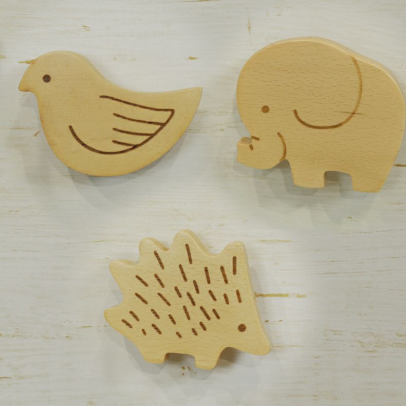 北欧雑貨を思わせる木製のトリとハリネズミとゾウの飾りがポイントです。