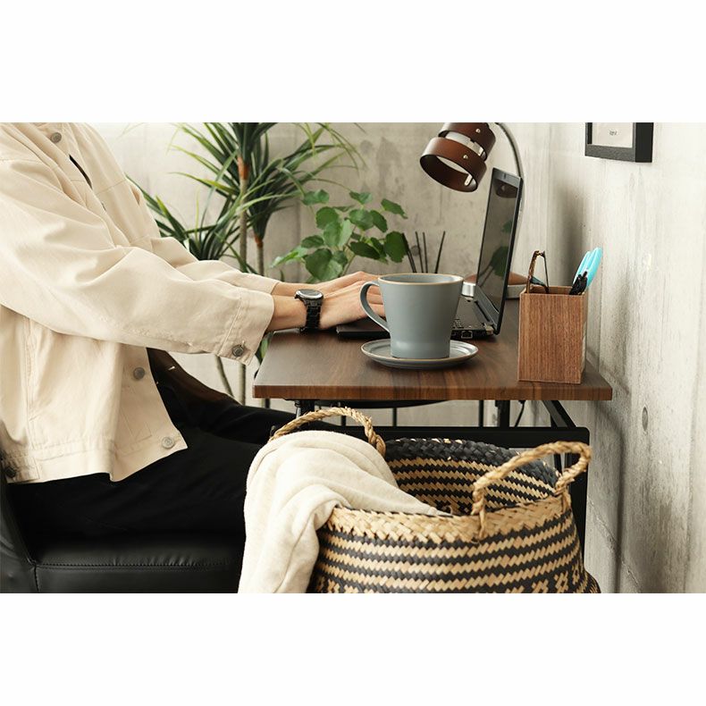 限られたスペースに置きやすい折りたたみデスク「レトラ」。ウォールナット柄の木目調天板には水や汚れに強PVCシートを採用。