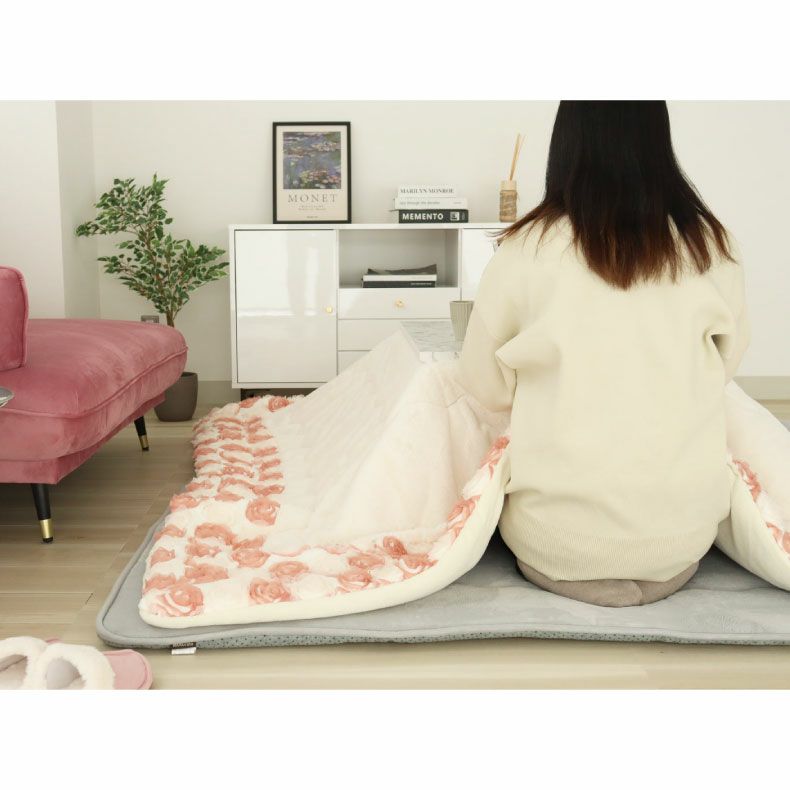 やわらかくふわっふわな手触りのラビットファーこたつ薄掛け布団「ラビットローズ」。あたたかくずっと触れていたくなる心地良さです。