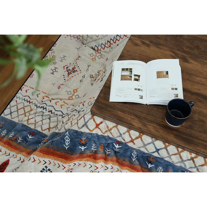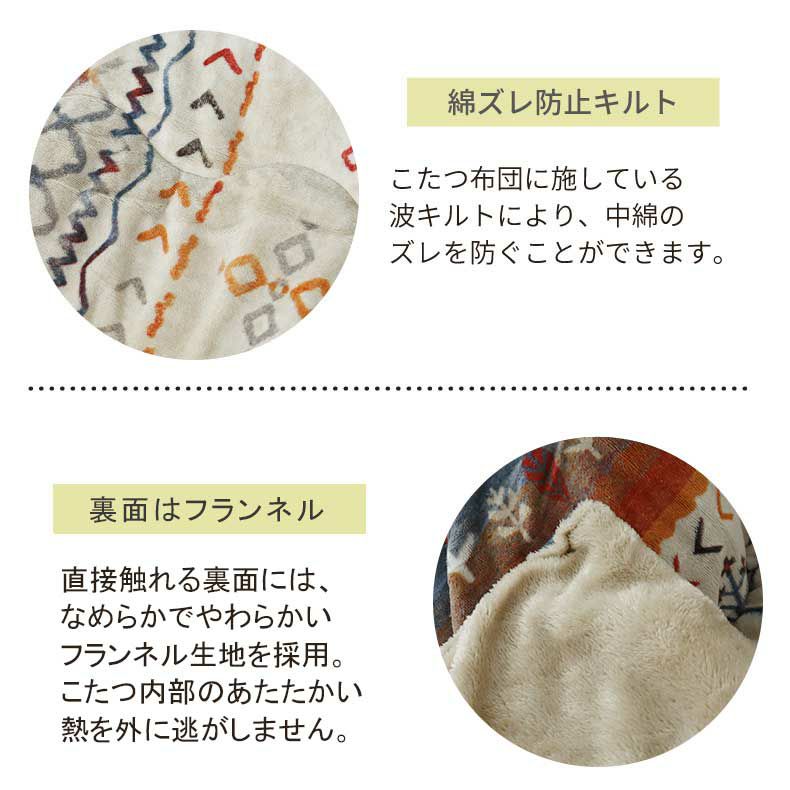 落ち着きのある色合いとデザインが人気ギャッベ柄のこたつ布団「アルバ」。フランネル生地を表にするとシンプルなデザインに。