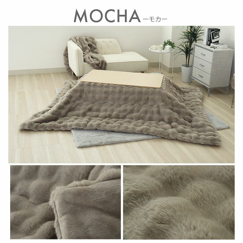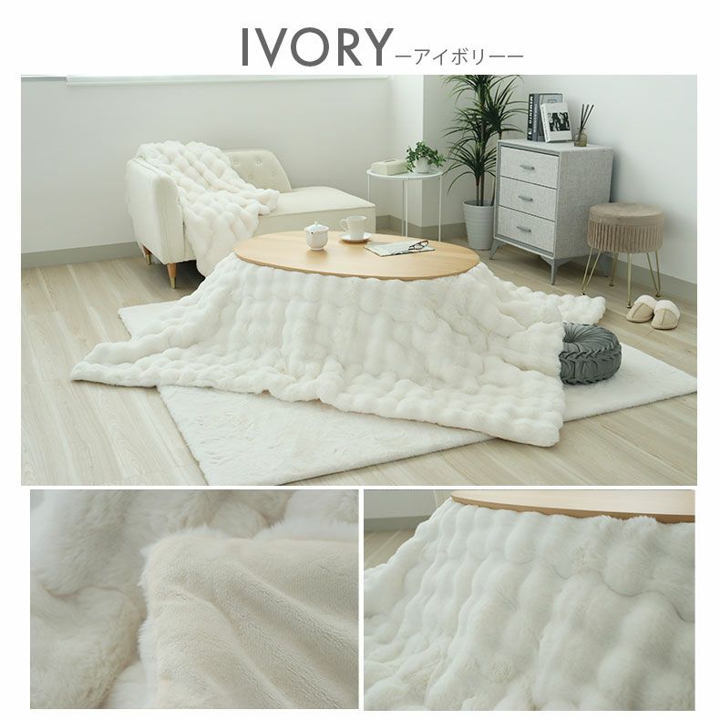 異なる毛の長さが織りなすフワフワのラビットファーを使ったあたたかいこたつ薄掛け布団
