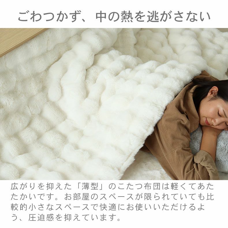 異なる毛の長さが織りなすフワフワのラビットファーを使ったあたたかいこたつ薄掛け布団