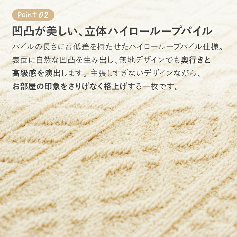ハイローパイルの凹凸が立体感を生み出し無地を映えさせます。