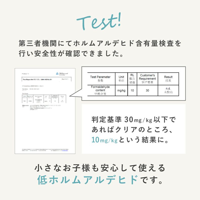 安心の低ホルムアルデヒド。敏感肌の方や小さなお子様にも安心してご使用いただけます。