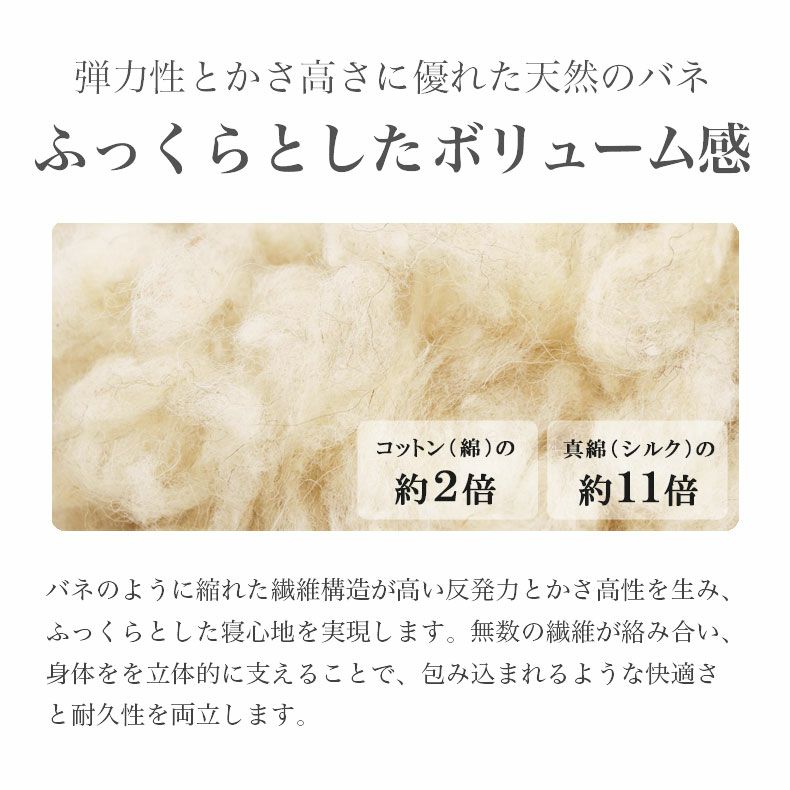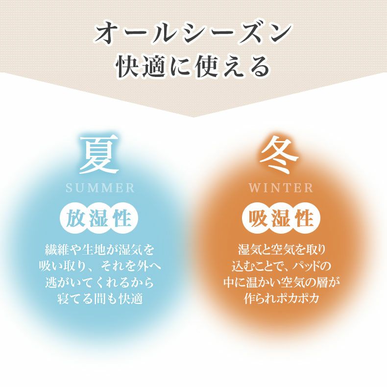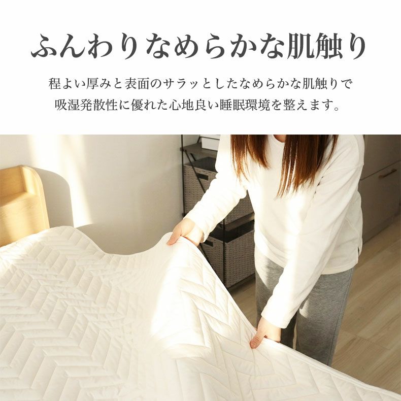 ウールわたを100%使用したベッドパッド。夏は汗をたっぷりと吸い取ってサラッとした肌触りで快適。冬は空気をたっぷり閉じ込めて保温します。