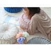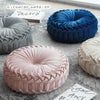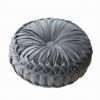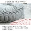 ダリアの花をイメージしたデザインの円形クッション「デコラ」。表面はなめらかで光沢感のある生地。