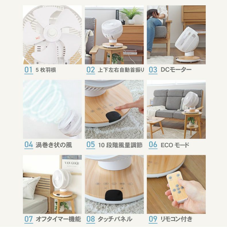 5枚羽根、上下左右自動首振り、DCモーター、渦巻き状の風、