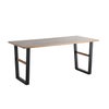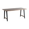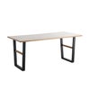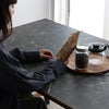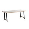 ストーン調の天板とスチール脚を組み合わせたモダンダイニングテーブル「TUM」。天板周りに質感に優れた無垢材を使用し、心地よい空間を作ります。