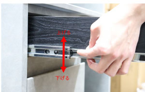 ②レバーがあるのを確認したら、図2のように指でレバーの上げ下げを左右行います。基本、どちらかのレバーは 「上げる」反対側のレバー「下げる」という形となります。どちらのレバーも指で操作しながら、引き出しを手前に引くと、引き出しが出せるようになります。