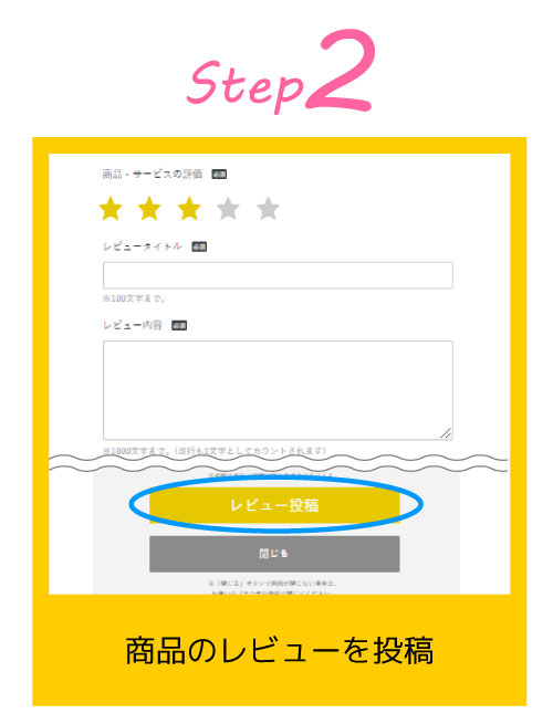 *②の際にレビューに写真を添付する場合は、JPEG、PNGまたはGIF形式、ファイルサイズ500KB~5MB以内で投稿ください。